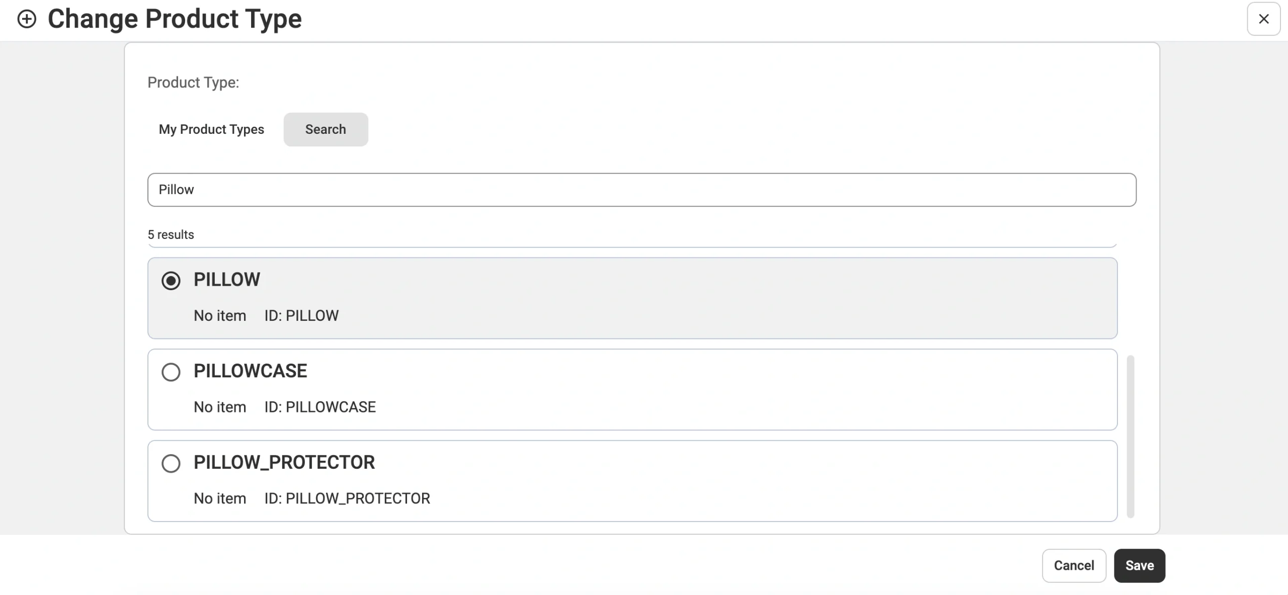3) Wählen Sie einen Product Type, der Ihr Produkt am besten kategorisiert. Sie können einen bereits verwendeten Typ auswählen oder manuell nach Name oder ID suchen.