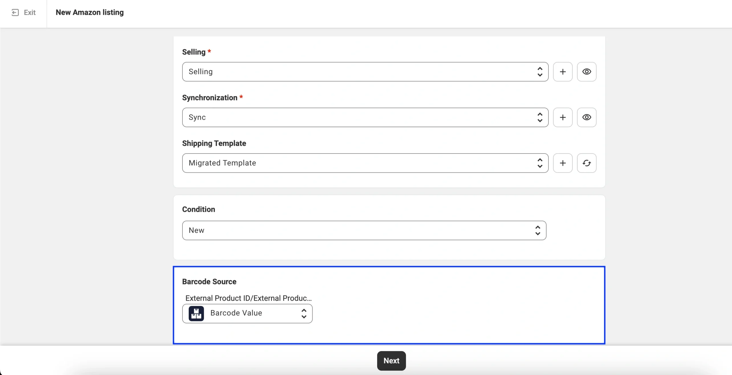M2E versucht automatisch, Ihr Produkt mit einer bestehenden ASIN abzugleichen, wenn Sie eine Auflistung auf Amazon erstellen. Die App verwendet den Wert für die Barcode-Quelle, den Sie im ersten Schritt der Auflistung auswählen. Stellen Sie also sicher, dass er auf das richtige Identifizierungsfeld verweist.