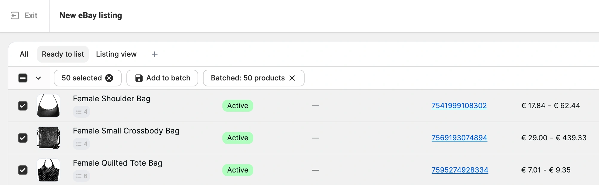 Verwenden Sie beim Erstellen neuer Auflistungen die Suchfunktion und Filter, um die gewünschten Artikel auszuwählen, und fügen Sie diese dann Ihrem Stapel hinzu. Passen Sie anschließend Ihre Kriterien an, suchen Sie weitere Produkte und fügen Sie auch diese hinzu. Sobald Ihr Stapel vollständig ist, können Sie alle darin enthaltenen Produkte auf dem Marktplatz einstellen.