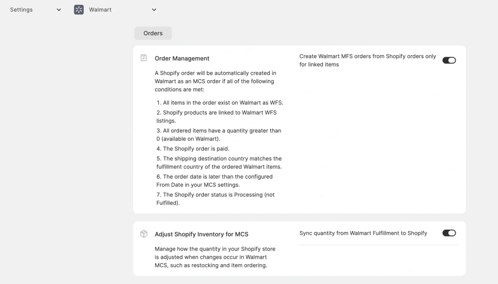 5) Aktivieren Sie die Option „Menge von Walmart Fulfillment mit Shopify synchronisieren“, um Ihren Shop-Bestand über MCS auf dem neuesten Stand zu halten.