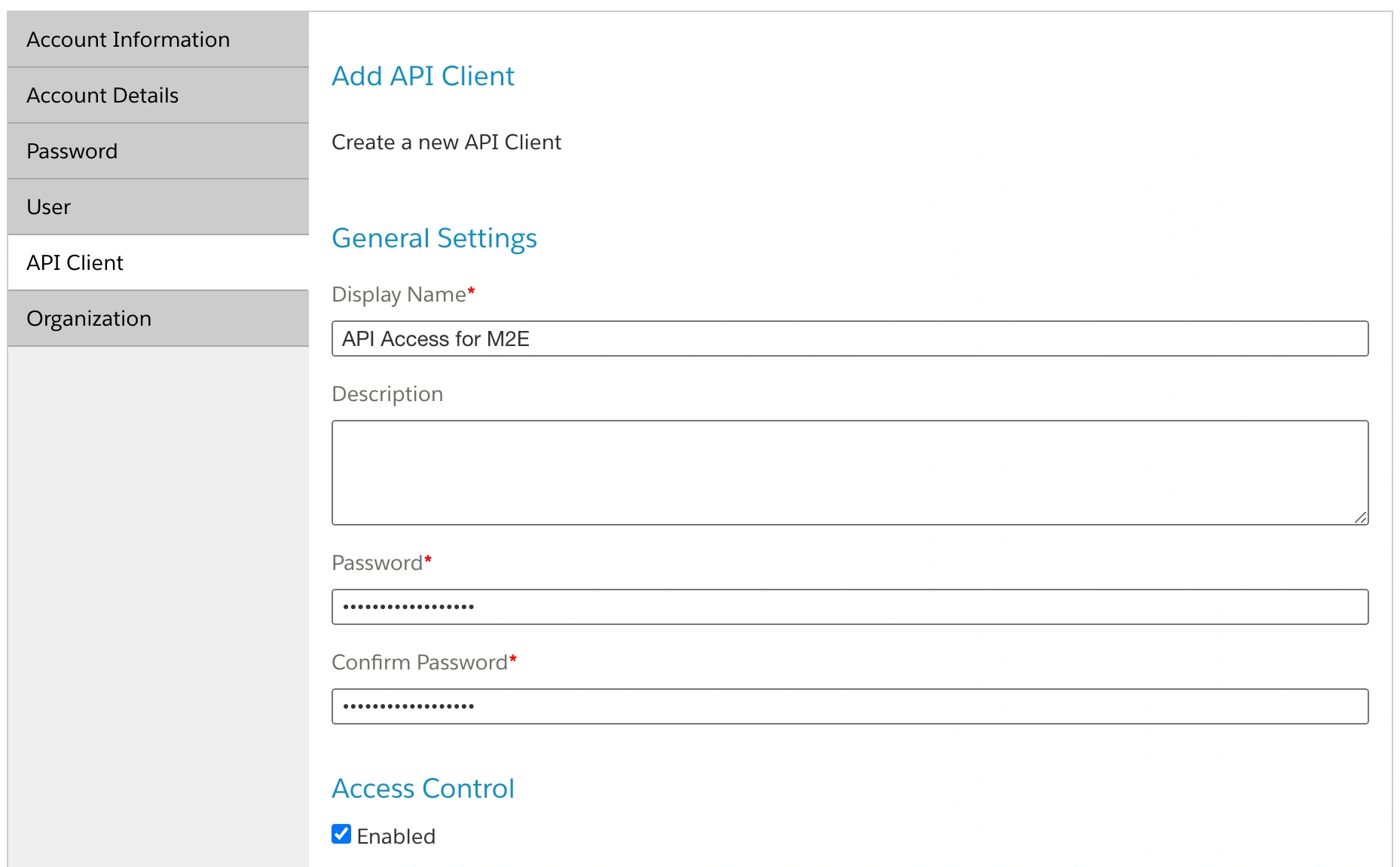 3) Provide a meaningful API Client name in the Display Name field, for example, "API Access for M2E".