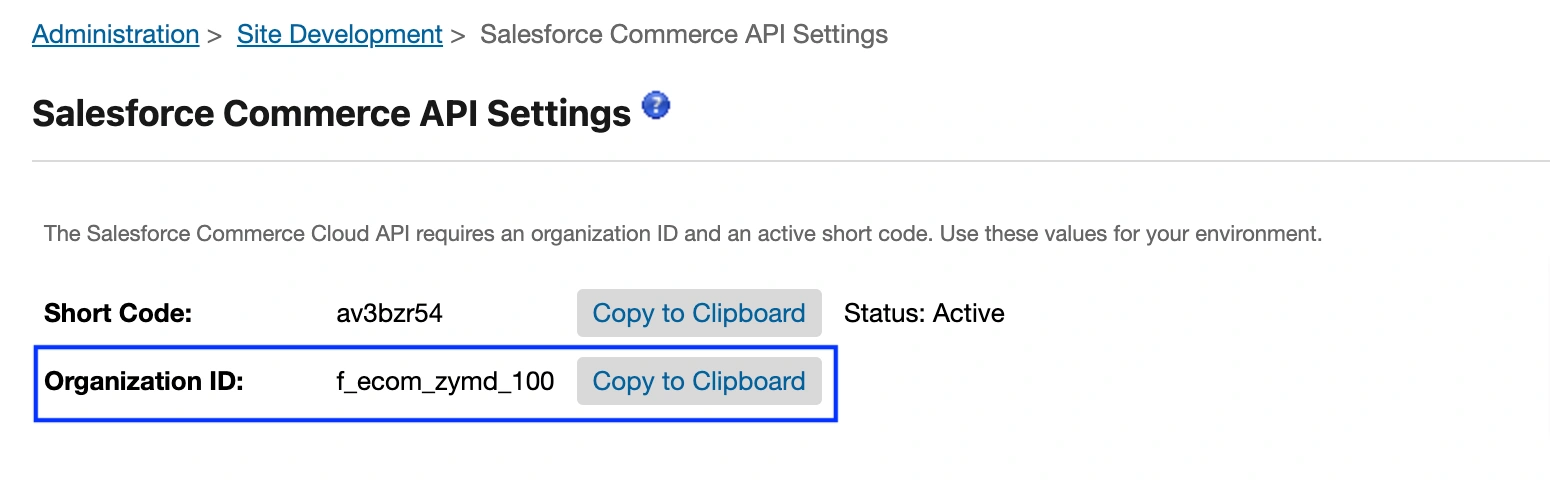 3) Navigate to Administration > Site Development > Salesforce Commerce API Settings. Your Organization ID will be visible on this page.