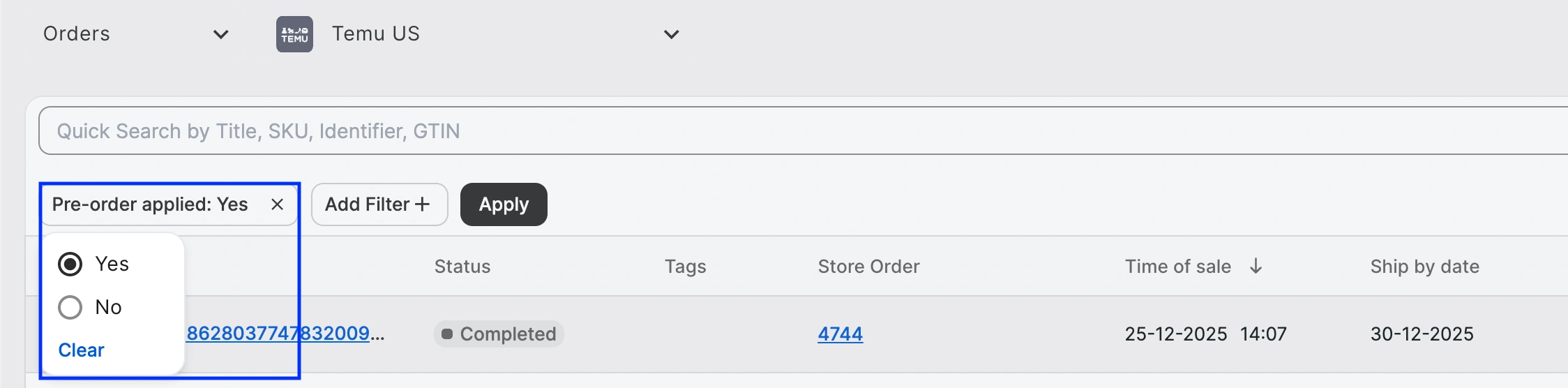 Use the “Pre-order applied” filter to identify and manage these Temu orders:
