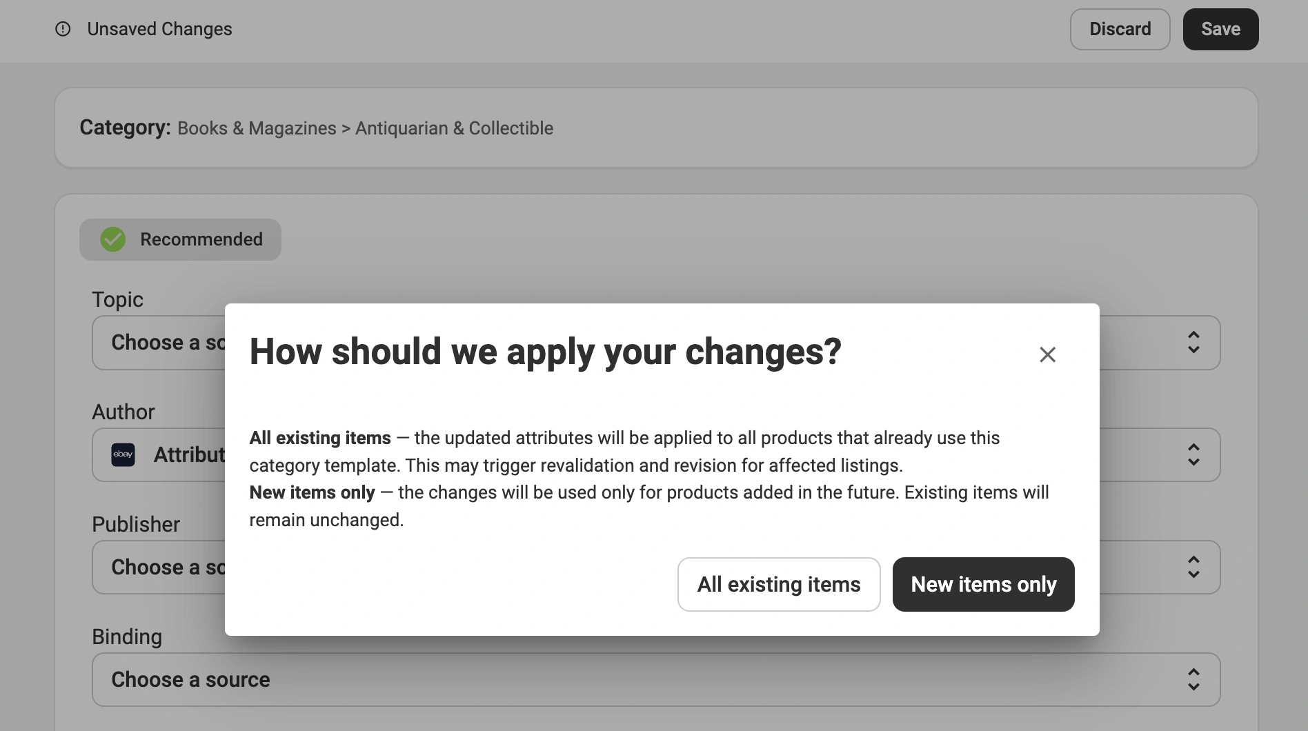 - New items only – applies the changes only to future listings. Existing products remain unchanged.