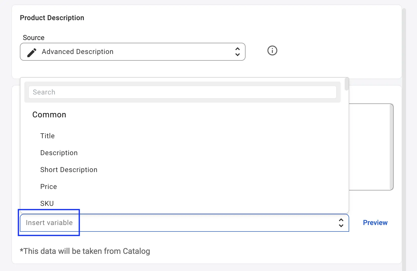 With Advanced Description, you get complete control. Paste your HTML template. Add variables from the list by clicking Insert variable. You can include details like Title, SKU, or images without manually editing each listing.