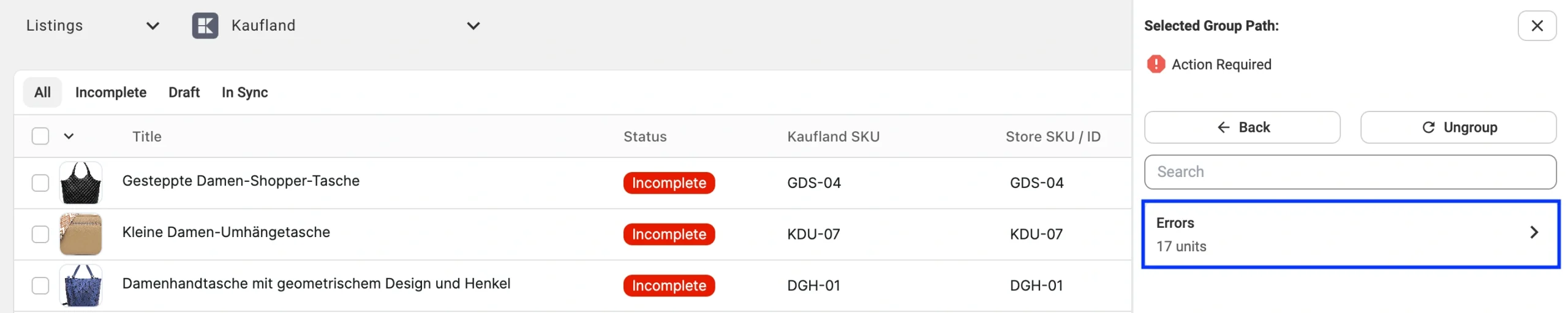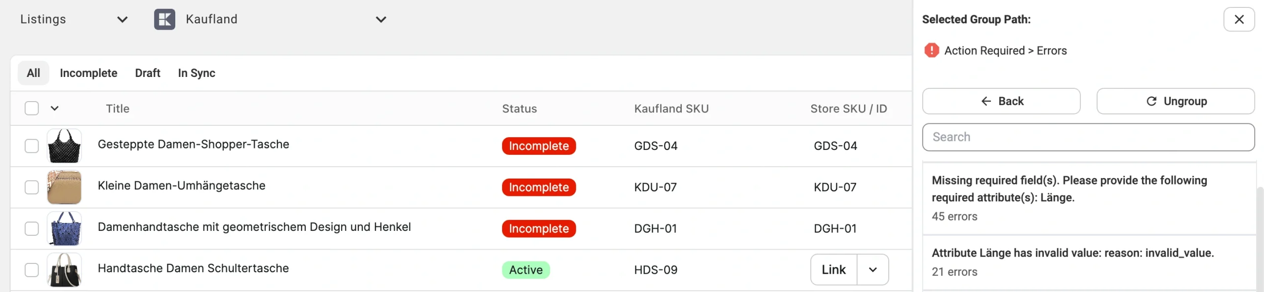 Cliquez sur le message d'erreur spécifique pour regrouper et examiner tous les produits Kaufland concernés par ce problème précis.