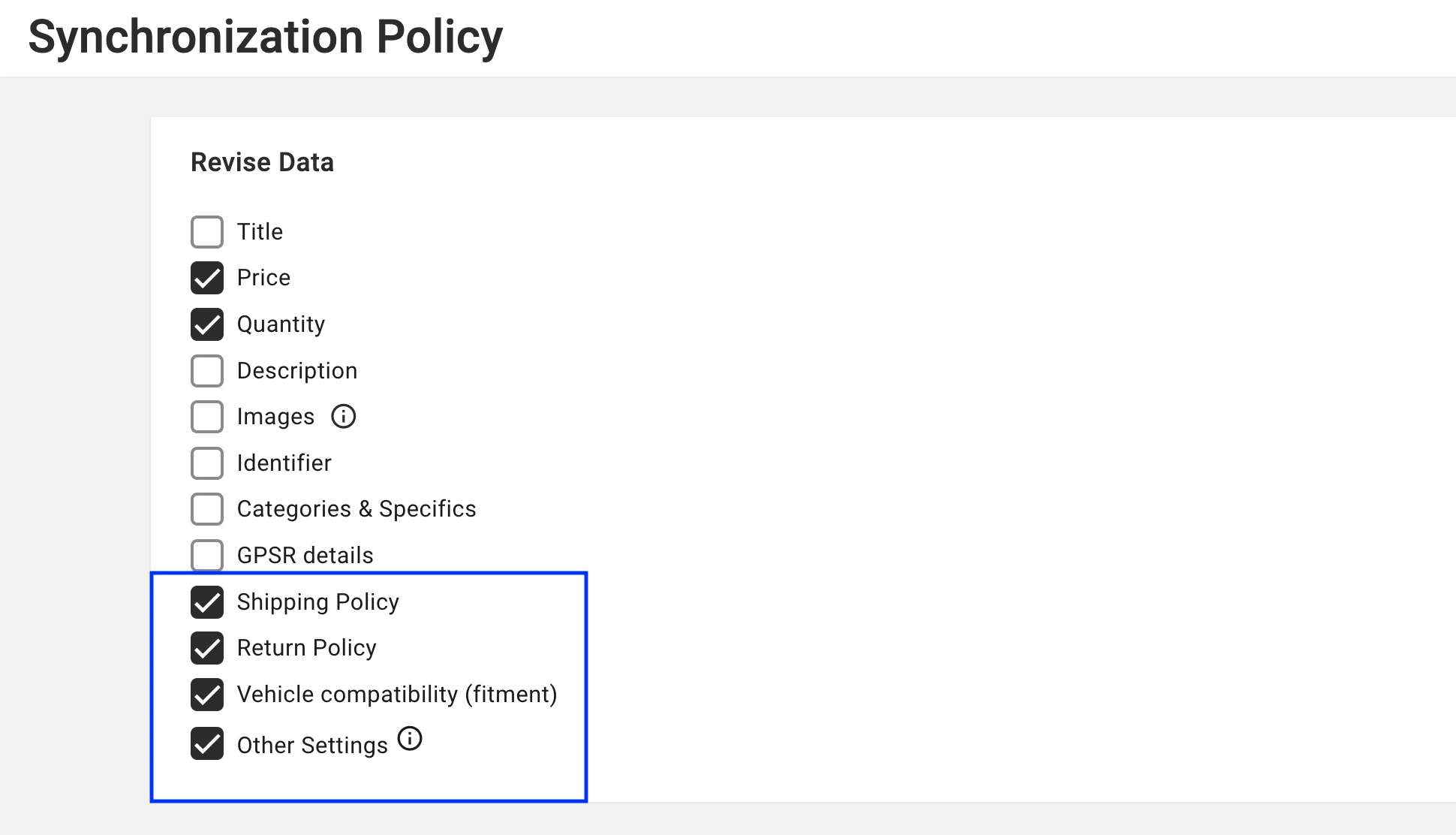 Accedi alla tua Politica di sincronizzazione eBay (Impostazioni > Politiche) e seleziona le caselle accanto ai campi che desideri mantenere sincronizzati.