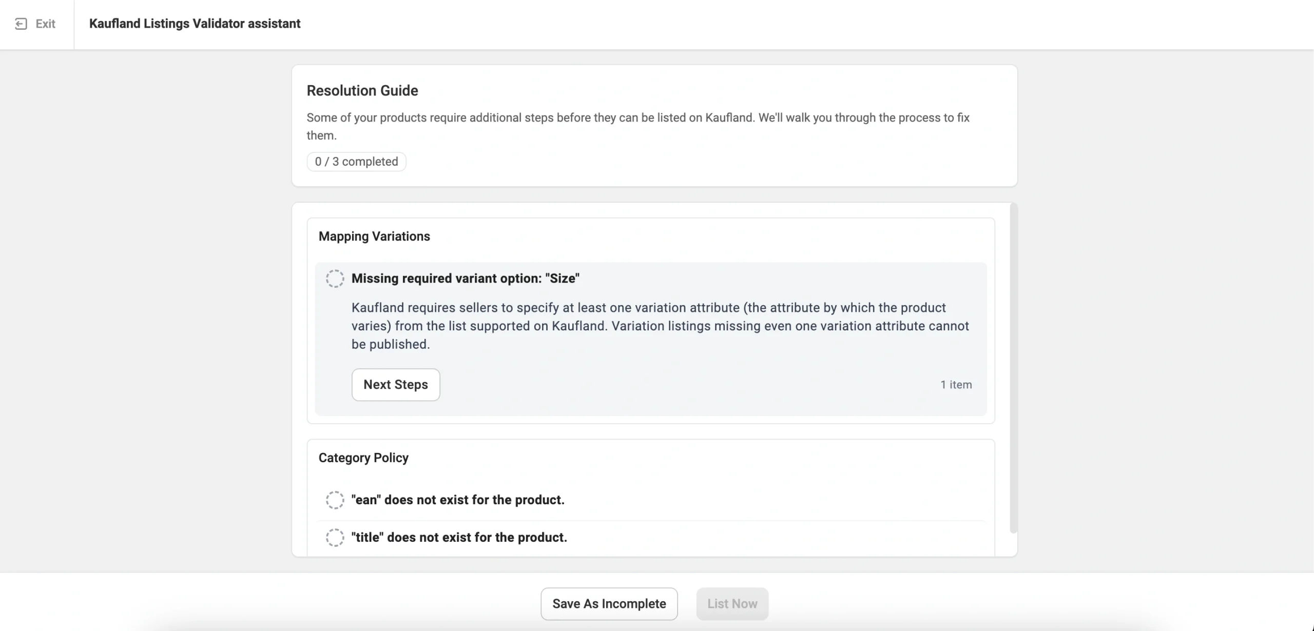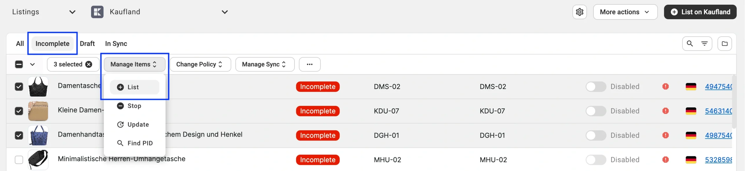 Para continuar resolvendo os problemas, filtre suas listagens da Kaufland para mostrar os itens incompletos. Selecione-os e clique em Gerenciar itens > Listar no menu de ações. Isso reabre o Assistente exatamente onde você parou.